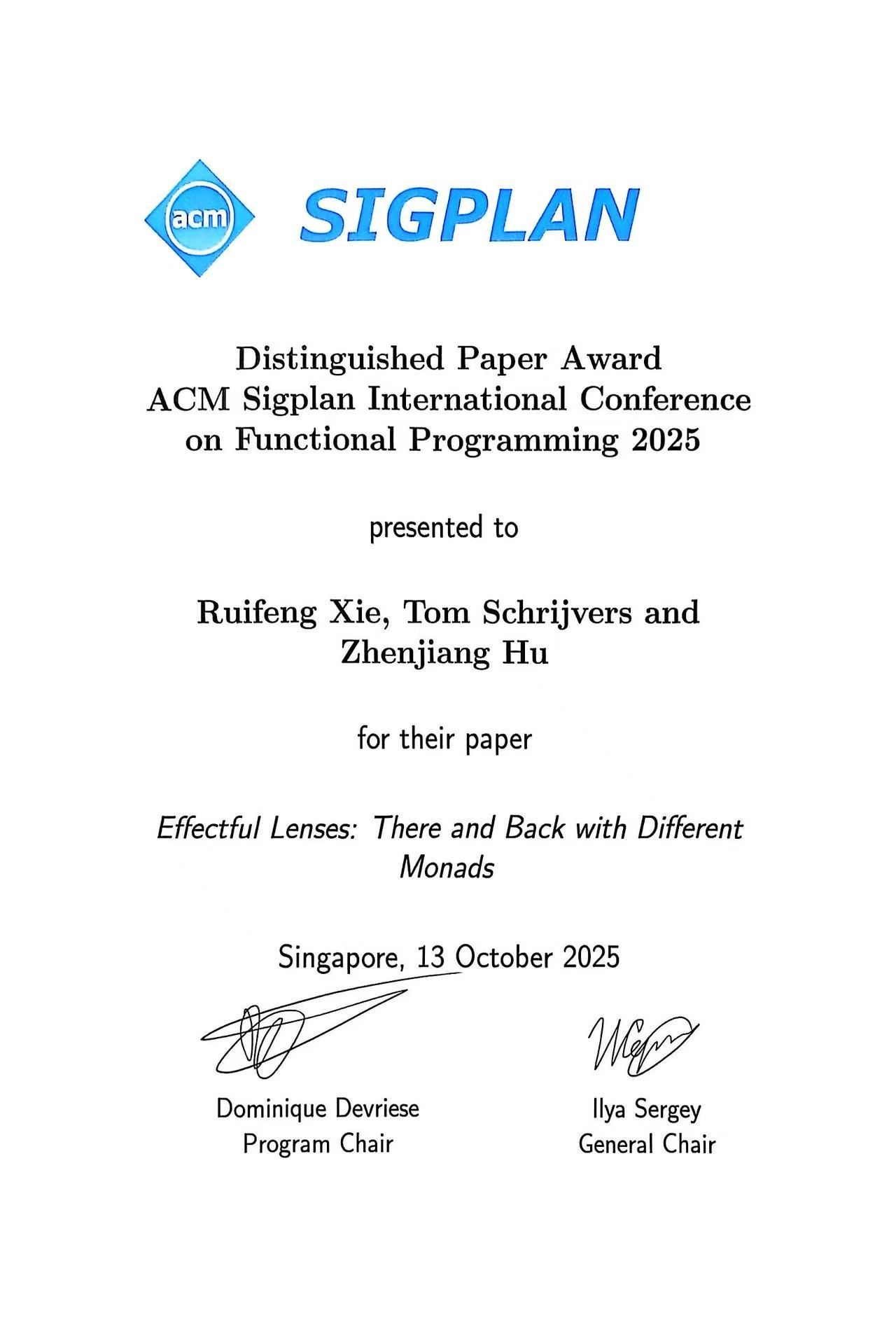 胡振江团队获 ICFP 2025 杰出论文奖