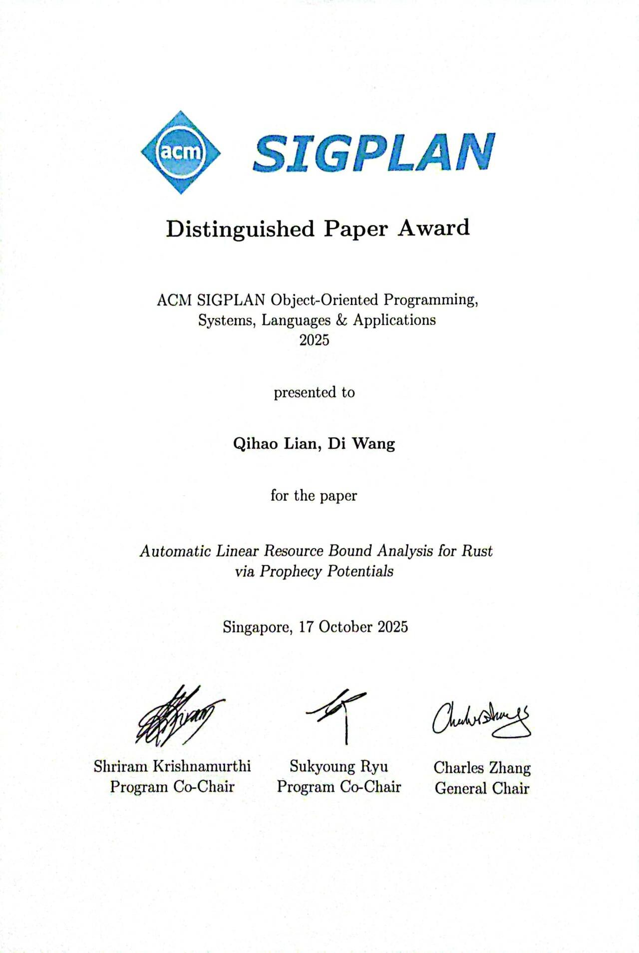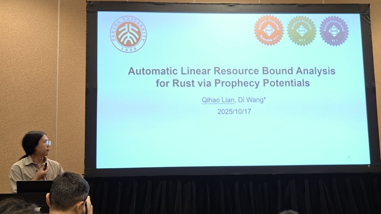 在刚刚结束的第 40 届程序设计语言领域会议 OOPSLA(SPLASH) 2025 上,北京大学计算机学院程序设计语言研究室关于Rust程序资源消耗分析的工作《Automatic Linear Resource Bound Analysis for Rust via Prophecy Potentials》荣获杰出论文奖(Distinguished Paper Award)。
